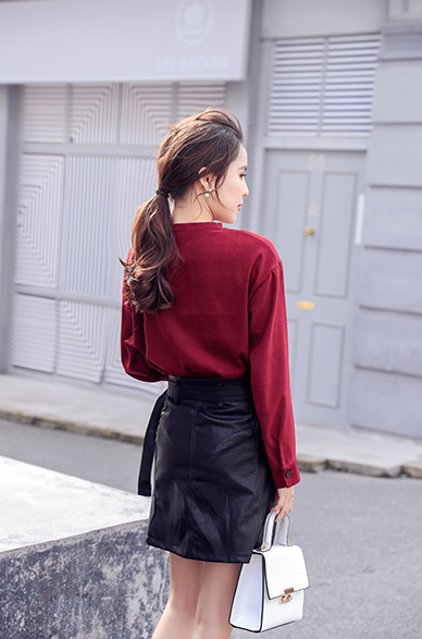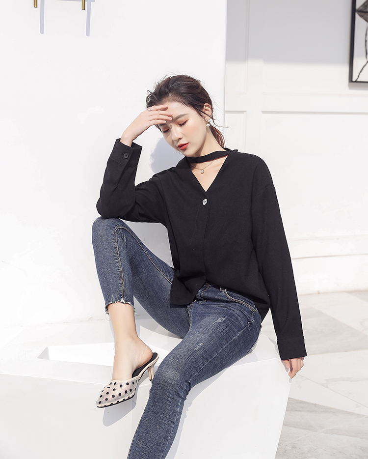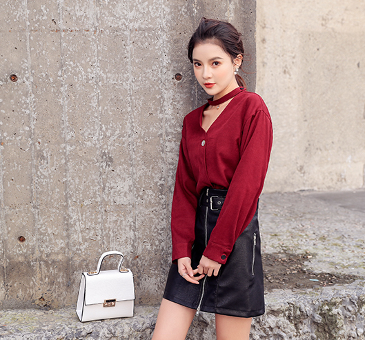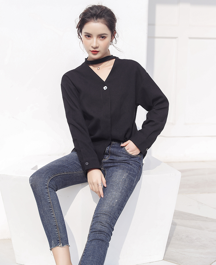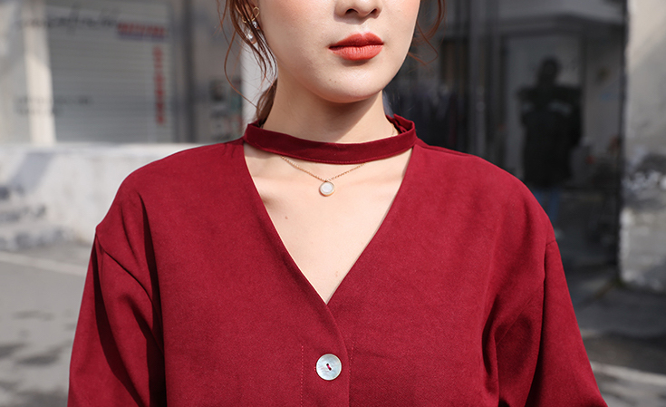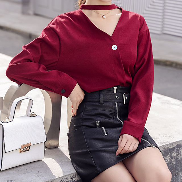 しっかりと開いた襟は鎖骨をキレイに、合わせてチョーカーが首元をすっきりと見せてくれます。