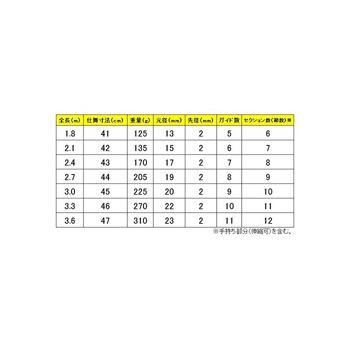 표준 전장:1.80~3.60m / 끝:41~47cm / 표준 자중:125~310g / 계수:6~12(※) / 가이드수:5~11 ※지수부분(신축가)포함한다