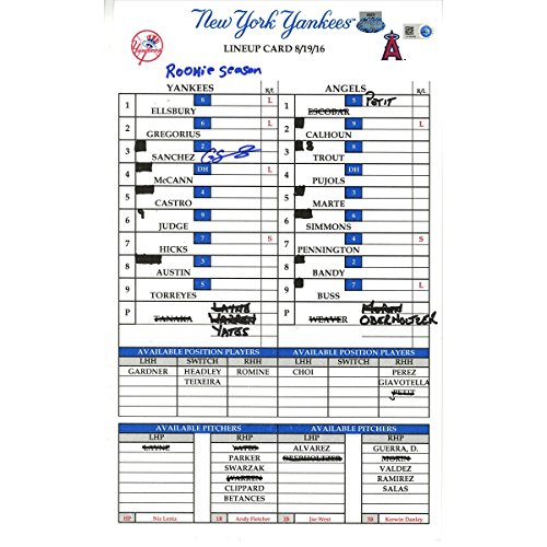 Gary Sanchez Signed Yankees at Angels 8-19-2016 Game Used Lineup Card w/ Rookie Season Insc (JC093933)