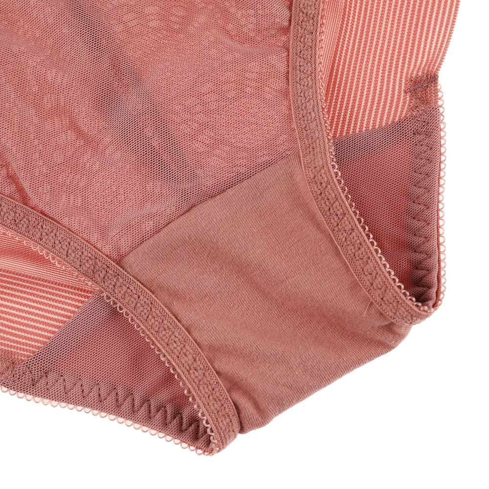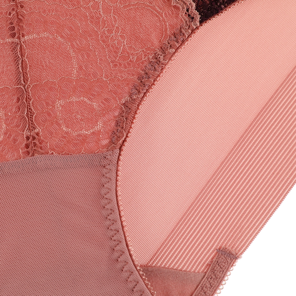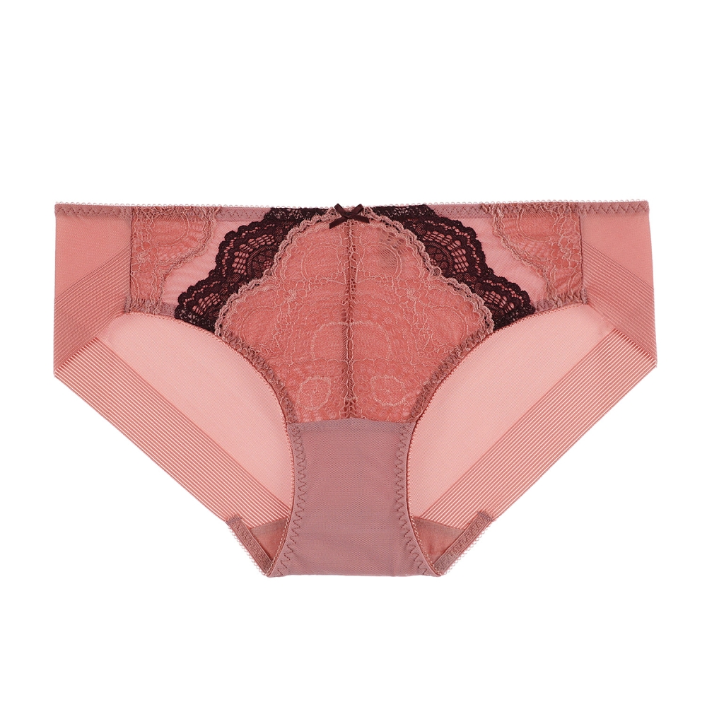 그라데이션 쉐도우를 하듯이 핑크브라운 컬러와 와인컬러를 투톤으로으로 매치한 레이스 삼각팬티. 앞중심 주자스트링 장식 포인트.