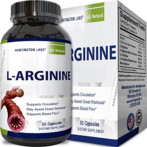 It's not always possible to reach adequate L-arginine levels, especially if there's an underlying medical condition present. Taking a supplement is the only way to ensure that you're providing your body with all it needs. Through its ability to dilate the blood vessels, this amino acid has the effect of lowering blood pressure and supporting a healthy cardiovascular system. Taking L-arginine also helps your body create urea, remove excess nitrogen and regulate waste and chemical imbalances. In addition to this, supplementing with L-arginine is believed to be beneficial to bodybuilders due to its ability to synthesize proteins and increase muscle mass. This also leads to increased strength and energy. For the best quality and most potent L-arginine available, Huntington Labs offers you 800mg in each capsule and other amino acids for maximum effectiveness and absorption. Our all natural formula comes with a 60-day money back guarantee for your ultimate satisfaction.Feature
