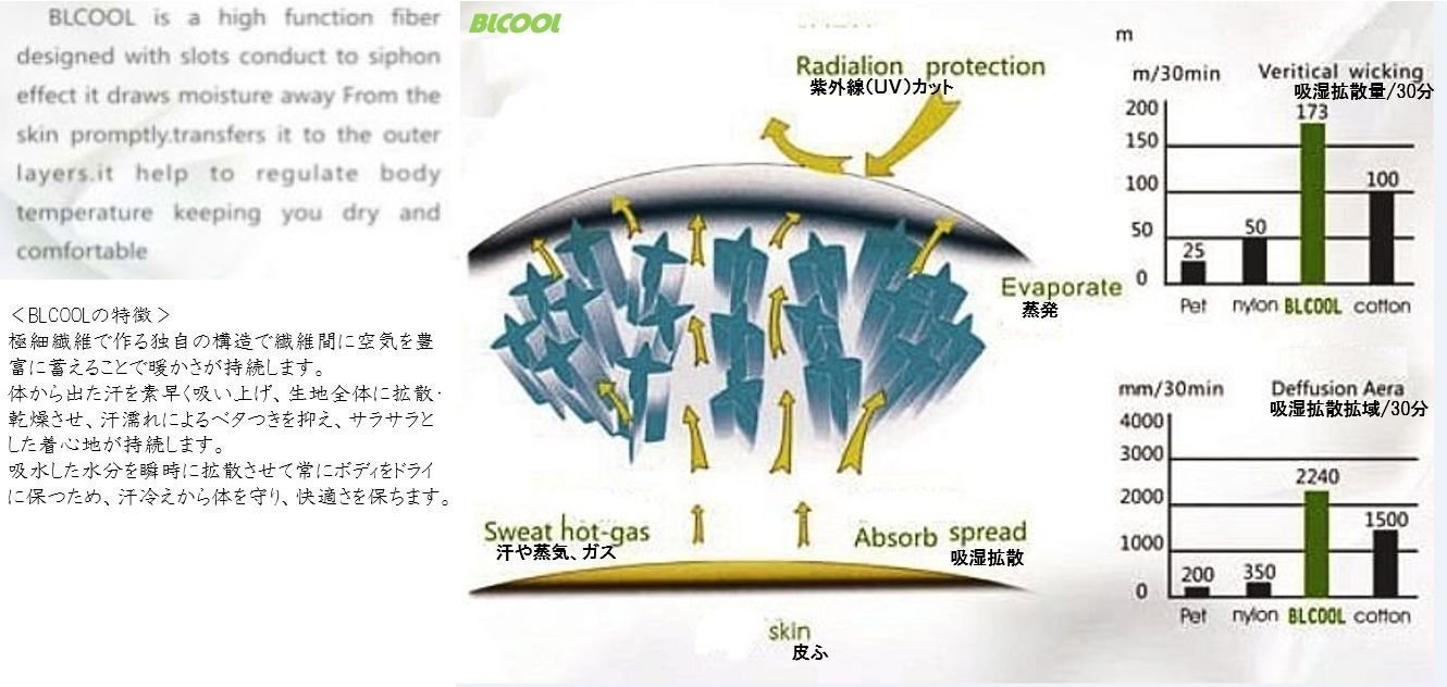 The material BLCOOL keeps the body dry at all times with high heat retention and moisture absorption and diffusion performance and it keeps the feeling of smoothness very excellent in breathability.