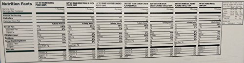 -. Feature : 8 Lays Brand Clasic Potato Ships, 4 Lays Brand Sour Cream & Onion Potato Chips / 4 Lays Brand Barbecue Flavored Potato Chips, 12 Cheetos Brand Crunchy Cheese Flavored Snacks / 12 Doritos Brand Nacho Cheese Flavored Tortilla Chips / 7 Doritos Brand Cool Ranch Brand Flavored Tortilla Chips / 7 Fritos Brand Original Corn Chips