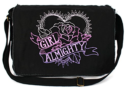-. Binding : Electronics -. Brand : Dancing Participle -. ClothingSize : One Size -. Color : black -. Department : unisex-adult -. Feature : Embroidered in the USA / 100% Cotton Canvas / Adjustable Shoulder Strap and Large Front Flap with Magnetic Snaps / Exterior and Interior Zippered Pockets, built in interior clip for attaching keys / The perfect size for books and supplies: 16" x 11.5" x 4.75" -. Model : 50092004190801 -. ProductGroup : PC Accessory -. ProductTypeName : CARRYING_CASE_OR_BAG -. Size : One Size -. Title : Dancing Participle Girl Almighty Embroidered Black Messenger Bag