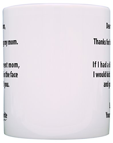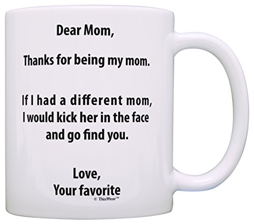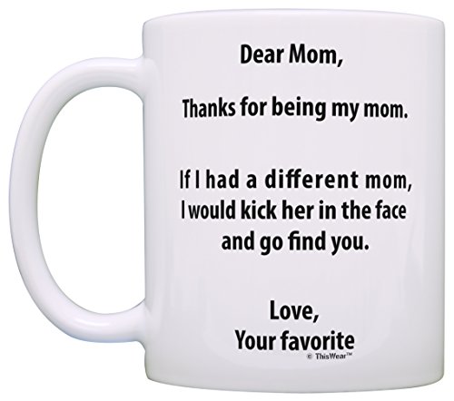 Product Description Funny mom gifts are the best mom gifts. Mugs like this make funny gifts for mom and are perfect birthday gifts for mom, Mother's Day gifts for mom, or thank you gifts for mom. Gift ideas for mom are easy when you give funny gifts for mom. This traditional 11 ounce white ceramic coffee mug is perfect for any hot beverage. Wide mouth and large C-handle allow for easy, every day use. Whether drinking your morning coffee at work, or sipping on a hot cup of tea at home, this mug is up to the task. Microwave and dishwasher safe for your convenience. All designs are lead free. 0