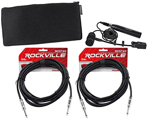 -. Feature : PRO 35 Cardioid Condenser Clip-on Instrument Microphone. UniMount clip permits accurate positioning, provides shock resistance and protects element. Cardioid polar pattern. Extended frequency response. 6' (1.8 m) cable permanently attached to microphone. Element: Fixed-charge back plate, permanently polarized condenser. Polar Pattern: Cardioid. / Frequency Response: 50-15,000 Hz. Low Frequency Roll-Off: 80 Hz, 18 dB/octave. Open Circuit Sensitivity: -45 dB (5.6 mV) re 1V at 1 Pa. Impedance: 250 ohms. Maximum Input Sound Level: 145 dB SPL, 1 kHz at 1% T.H.D.. Dynamic Range: (typical) 115 dB, 1 kHz at Max SPL. Signal-To-Noise Ratio: 64 dB, 1 kHz at 1 Pa. Phantom Power Requirements: 11-52V DC, 2 mA typical. Switch: Flat, roll-off. / Weight: (Microphone) 0.3 oz (8 g). Weight: (Power Module) 2.9 oz (81 g). Dimensions: (Microphone) 0.98" (25.0 mm) long, 0.40" (10.2 mm) diameter. Dimensions: (Power Module) 3.66" (92.9 mm) long, 0.74" (18.9 mm) diameter. Output Connector: (Power Module) Integral 3-pin XLRM-type. Cable: 6.0' (1.8 m) long (permanently attached to microphone), 0.10" (2.6 mm) diameter, 2-conductor, shielded cable with TA3F-type connector. / Designed for sax, , brass and percussion, the PRO 35 excels in high-SPL applications and is ideal for active stage performances. Its extended frequency response captures subtle nuances of the performance. The included UniMount clip permits accurate positioning and provides shock resistance while protecting the element. The microphone's cardioid polar pattern reduces pickup of sounds from the sides and rear, improving isolation of the desired sound source. / Rockville RCGT20 1/4'' TS to 1/4'' TS Guitar / Instrument Cable. 24 AWG 100% Copper Conductors for Enhanced Signal Clarity. Nickel Plated, 1/4" Straight-to-Same Connectors. High Density 90% Coverage OFC Braid Shield for Superior EMI and RFI rejection. Length: 20 Ft. Color: Black
