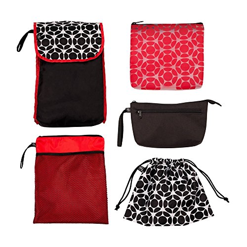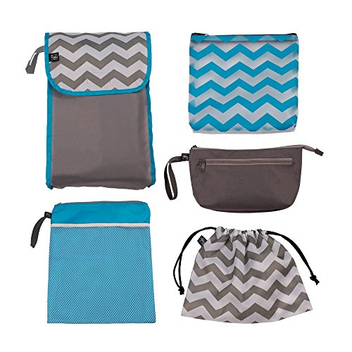 Get organized and turn any bag into a diaper bag. The J.L. Childress Diaper Bag Organizer, a set of five unique pouches, provides easy organization for any diaper bag or turns your favorite purse, tote or backpack into a perfectly organized diaper bag. Each pouch features a different color, pattern and fabric - making each one easy to find and grab. Packing, unpacking and moving baby's cargo between diaper bags, purses and strollers is made easy. All pouches are made from durable yet lightweight materials and are easily washed or wiped clean. The Wet and Dry Clothes Bag features a mesh exterior pocket, zippered top and waterproof, leak-proof interior lining. The Diapers and Wipes Pouch easily fits a full-size changing pad, wipes and 4-6 diapers. The Drawstring Accessories Pouch can be used for anything. We love using it for small toys and books or as a toiletry bag with baby's medicines, mom's lip gloss, tissues and more. Feeding Essentials Bag features a zippered top and clear, wipeable material for easy transport of snacks. The Personal Clutch holds cell phone, keys, sunglasses and more. The Clutch also features credit card slots on the interior, a zippered pocket on the exterior and a convenient wrist strap.Feature