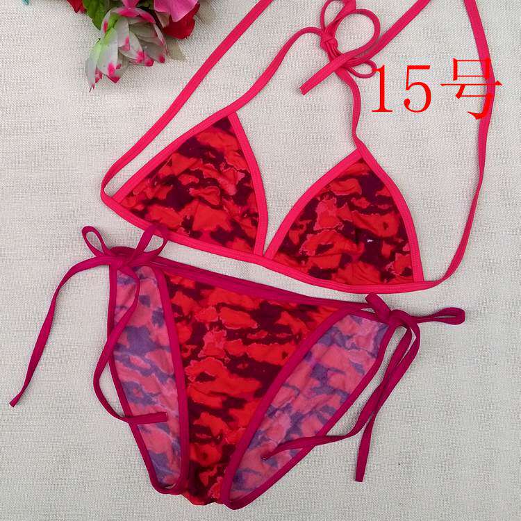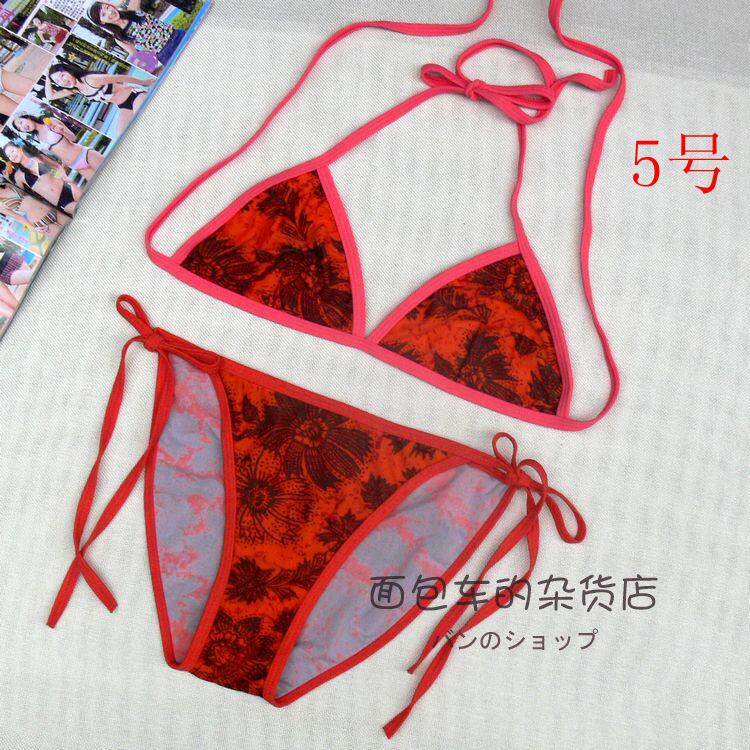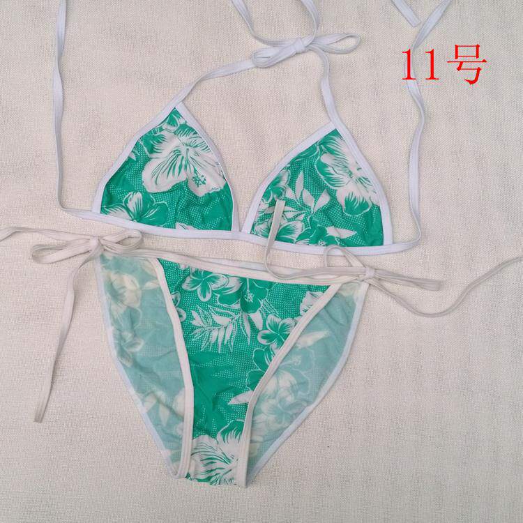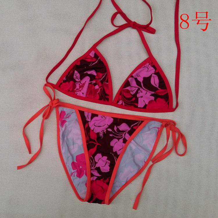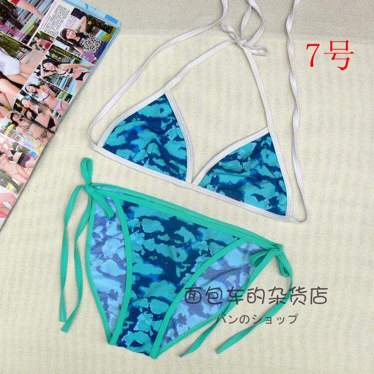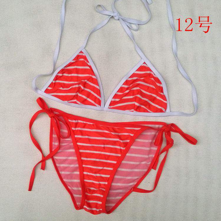【质料】泳衣布 弹力料 (82%Nylon,18%Spandex) 【颜色】详看图片(以实物为准)有色差,有轻微染色 (带子上衣和裤子颜色不一样) 【尺寸】上衣:B杯偏大 围:系绳调节 无胸垫 不能加垫 裤子:系绳调节 不连带子 前23cm 后32cm 高25cm 合适 26~ 29码的MM 购买前物必须看清楚货物的码数