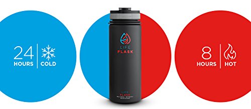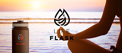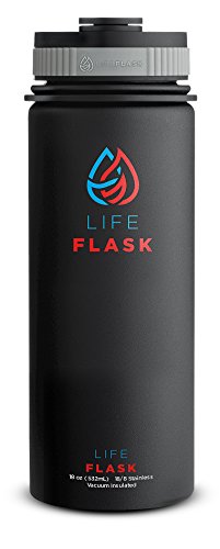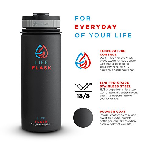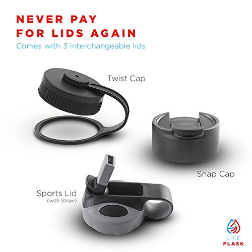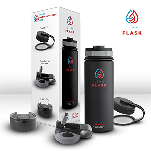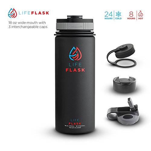 LIFE FLASK Double Wall Stainless Steel Water Bottle With 3 Interchangeable Lids- Never Buy Lids Again - Stainless Steel Vacuum Insulated 18oz Wide Mouth