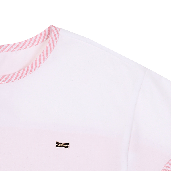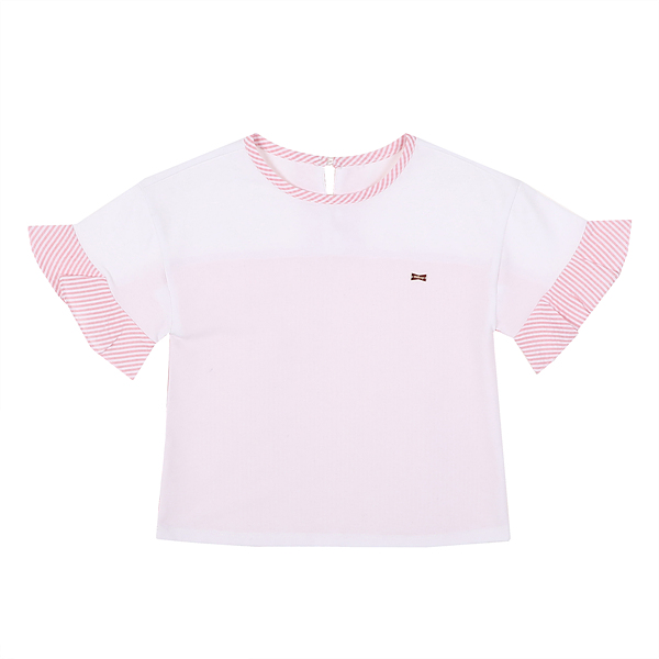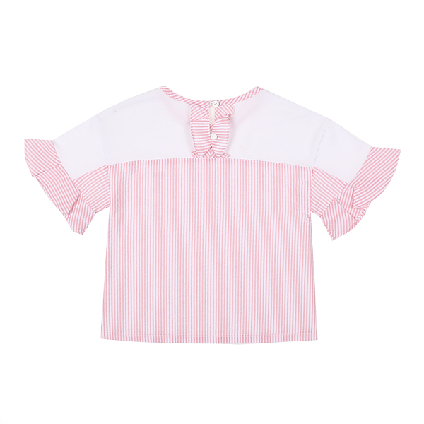 상세설명-뒷판과 소매프릴단이 시어서커 스프라이프원단이 배색으로된 티셔츠로 귀여운뒷트임 프릴단이 포인트인아이템입니다.