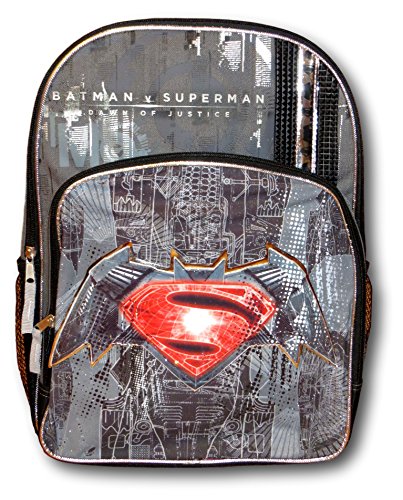 -. Brand : DC Comics -. Color : Black -. Department : boys -. EAN : 0840716153702 -. Feature : Large zippered compartment, zippered front pocket / 2 side mesh pockets / Top loop allows easy hanging / Durable fabric and lining hold up for extended use / Dimensions: 16 x 12 x 4 inches -. ProductGroup : Apparel -. ProductTypeName : LAGE -. Size : Large -. Title : Superman vs Batman Black Large 16" Backpack w/ Logos -. UPC : 840716153702