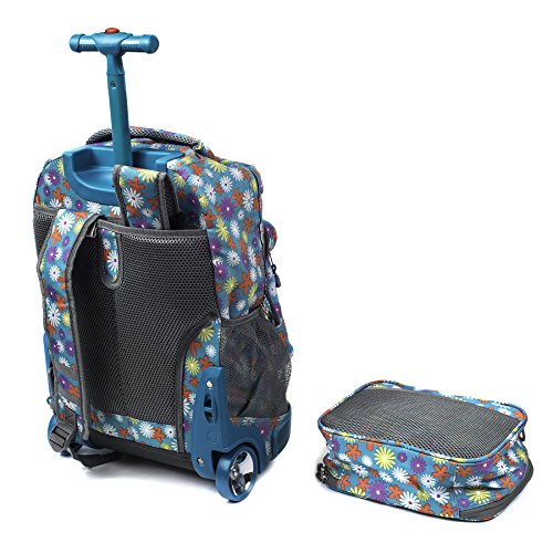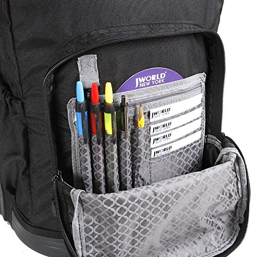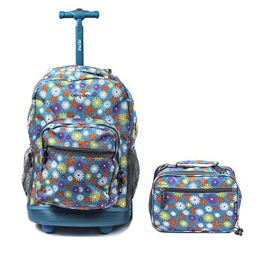 -. Brand : J World New York -. Department : unisex-child -. Feature : Recessed three stage locking handle with push button / Soft and noiseless wheels for stable and controlled motion / Air mesh cushion padded shoulder straps and back with slip-in system / Quality 600D Polyester, Color matched bottom mold for protection / Organized front pocket with pencil holder, key fob and mesh pocket -. Model : RBS-18, LB-01 -. PackageQuantity : 2 -. ProductGroup : Apparel -. ProductTypeName : LAGE -. Title : J World Sunrise Rolling Backpack & Cody Lunch Bag Set
