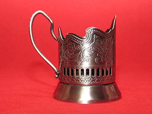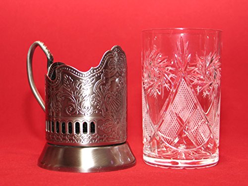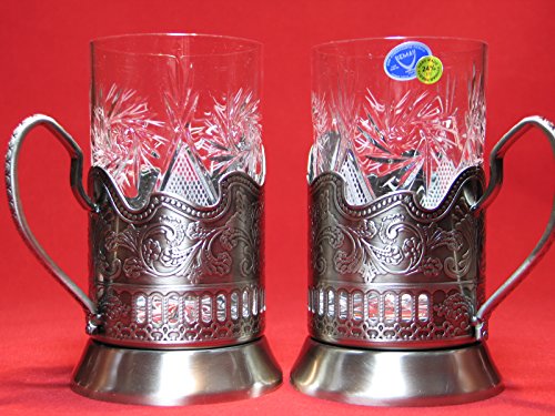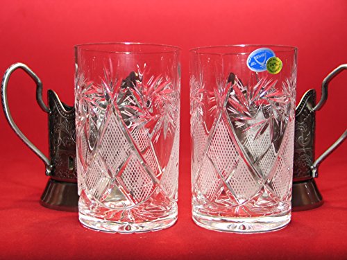 -. Title : 2 ea Old Fashioned Russian Cut Crystal Glasses & Matching Metal Glass Holders Podstakannik suitable for hot/cold liquids