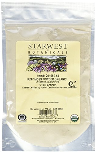Studio : Starwest Botanicals Publisher : Starwest Botanicals Binding : Health and Beauty Product Description Chondrus crispus is considered by some to be a nutritious and remarkable gift from the sea. Full of rich nutrients, Irish Moss is used by some herbalists to make a tonic for promoting a vibrant glow. Irish Moss is used for its mild laxative properties. Origin: Canada Common Names: Carragheen, Carrageenan USDA Organic Kosher Certified Certified Organic Did you know that this bushy seaweed, Chondrus crispus or Irish Moss, saved thousands of Irish from starvation during the potato famine of the mid-19th century? Irish moss is a curly red, purple, or yellow green plant which is found clinging to submerged rocks. This tough and stringy seaweed grows in tidal pools along the northern Atlantic. Chondrus crispus is harvested commercially to make carrageenan, a thickening agent for jellies, puddings, and soups, and is also a well-known traditional herbal remedy in Ireland. The typical preparation of Irish Moss is as a powder used in a tea or tincture. Chondrus crispus is sometimes combined with cinnamon or licorice as a soothing remedy. 0