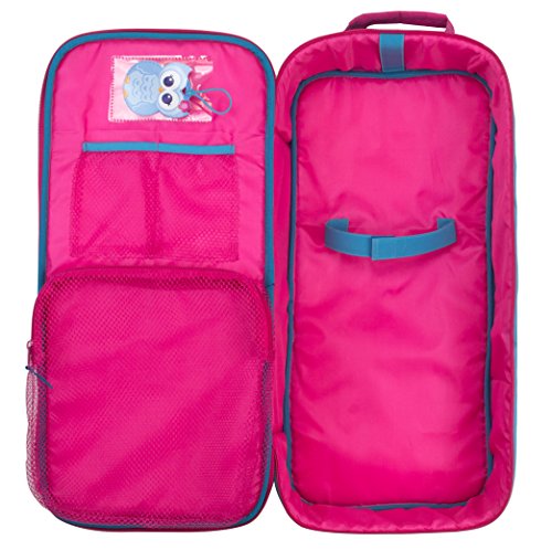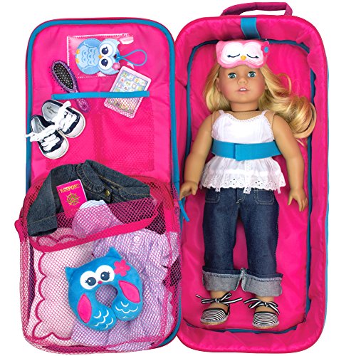 -. Feature : 18 Inch Doll Travel Case, Cross Shoulder Backpack / Hot Pink Polka Dot Suitcase for Transporting Dolls / Mesh Bags for Additional Storage: One with Zipper, One with Elastic / Owl Name Tag, Elastic Strap to keep doll secure / Designed in the USA. Made by Sophia's, leading doll clothes and accessory maker!