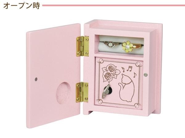 猫の絵柄の表紙を開けるとオルゴール、さらにリングさしが付いています。