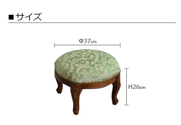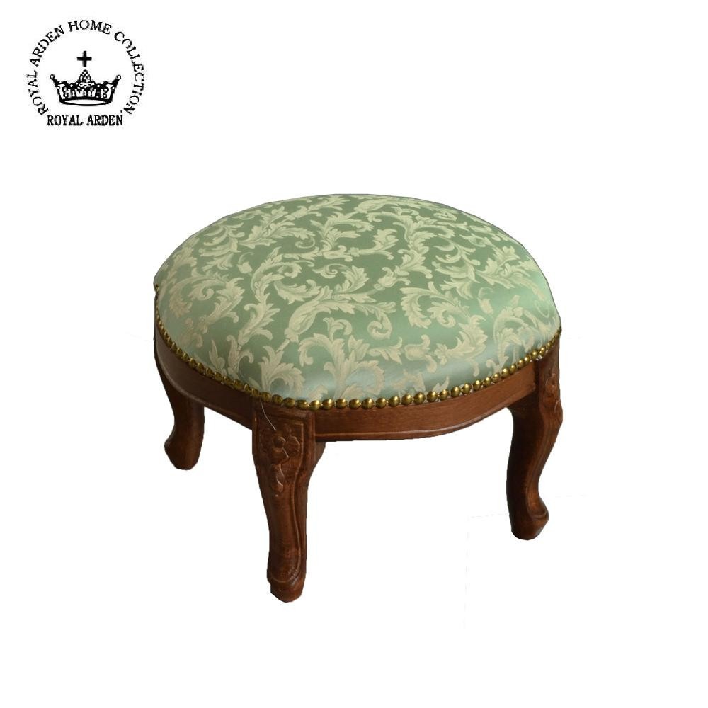 アンティーク調のおしゃれなスツールです。エレガントなお部屋にぴったり。 製造国:イタリア 素材・材質:脚:天然木ビーチ材ファブリック:綿65%、ポリエステル35% ※サプライヤー直送品 ※2019年4月下旬入荷分予約受付中【商品名】ロイヤルアーデン イタリアスツール ラウンドミニスツール グリーン 茶脚 51425