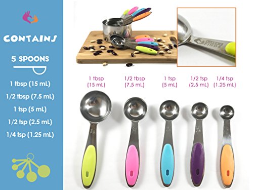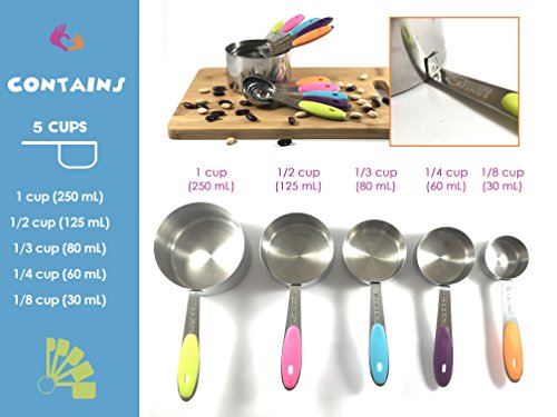 - FUN, QUALITY TIME WITH YOUR CHILDREN. These tools are perfect not only for baking and cooking but also for arts and crafts. It is designed with your children in mind so we chose grips in fun colors. It can be nested together so that storage is never a hassle. Package includes 5 pieces of measuring cups: 1 cup (250 mL), 1/2 cup (125 mL), 1/3 cup (80 mL), 1/4 cup (60 mL), and 1/8 cup (30 mL); 5 pieces of measuring spoons: : 1 tbsp (15 mL), 1/2 tbsp (7.5 mL), 1 tsp (5 mL), 1/2 tsp (2.5 mL), and 1/4