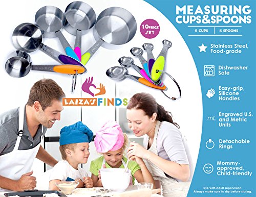 Laiza's Finds' 10 pc Stainless Steel Measuring Cups and Spoons Set. – Incl. 5 Cups, 5 Spoons, and Clips. for Liquid (Wet) or Dry Ingredient. Safe for Kids (thick) and Stackable (Nesting).