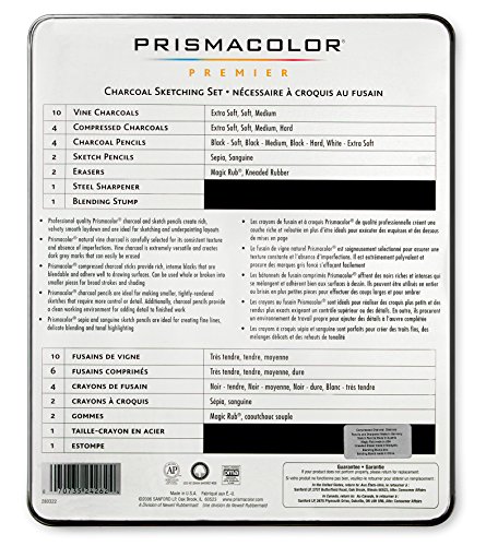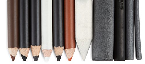 -. Feature : Smooth, dark and artist-quality, the sketch and graphite pencils create intense marks ideal for drawing and underpainting layouts / Natural vine charcoal is meticulously selected for consistent, imperfection-free texture - create dark, easily-erasable marks. Compressed charcoal sticks lay down rich blacks that blend easily and adhere to most drawing surfaces / Clean, precise charcoal pencils are ideal for tightly-rendered drawings requiring control and detail. Sepia and Sanguine pencils mark fine lines and help with highlighting / Steel sharpener and sanding board help you create the perfect point. Vinyl Magic Rub eraser is ideal for delicate surfaces. Kneaded rubber eraser molds to exactly the shape you're erasing / Includes: 10 vine charcoals (extra soft, soft & medium), 4 compressed charcoals (extra soft, soft, medium & hard), 4 charcoal pencils (black, soft black, medium black, hard white & extra soft), 2 erasers (Magic Rub vinyl & kneaded rubber), 1 steel sharpener, 1 sanding board and 1 blending stump