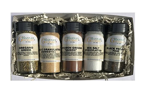-. Binding : Misc. -. Brand : HANNA'S GOURMET -. Feature : EACH ITEM PACKED IN 4 fl. oz. GLASS JAR / ALL NATURAL / 100% PURE / STAR K CERTIFIED -. Label : JR SPICE CO -. Manufacturer : JR SPICE CO -. ProductGroup : Grocery -. ProductTypeName : GROCERY -. Publisher : JR SPICE CO -. Studio : JR SPICE CO -. Title : GOURMET SPICE GIFT SET - A STEP ABOVE (5 PACK)