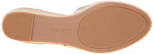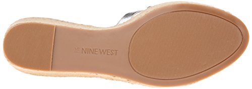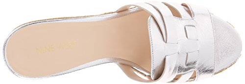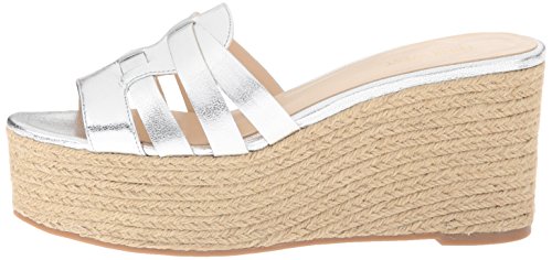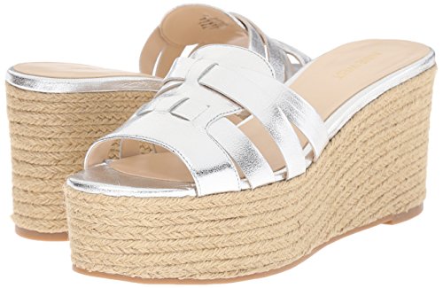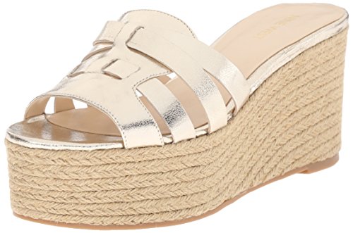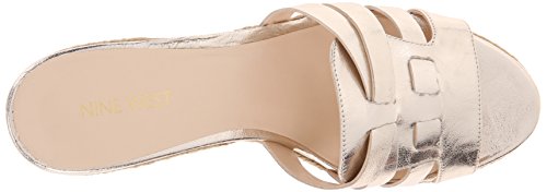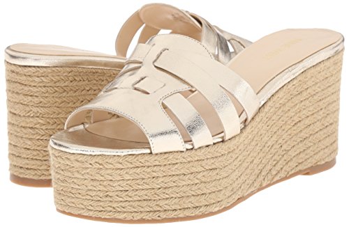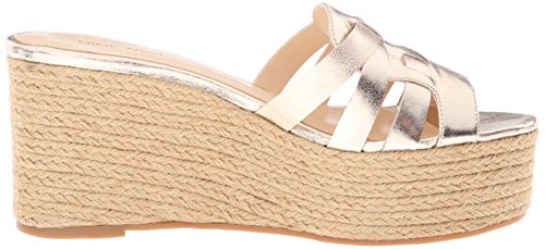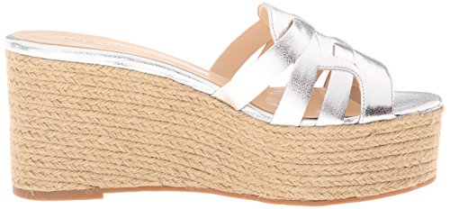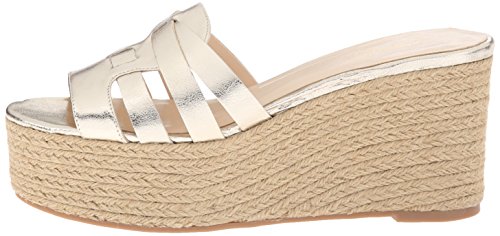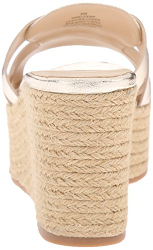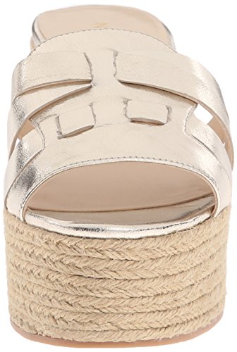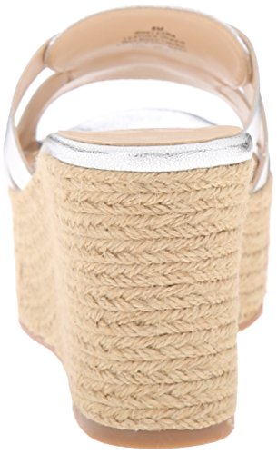 Slide sandal featuring metallic leather straps atop braid-wrapped platform