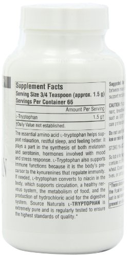 ReleaseDate : 2017-10-04 Studio : Source Naturals Publisher : Source Naturals Binding : Health and Beauty Product Description The essential amino acid l-tryptophan helps support relaxation, restful sleep, and positive mood. It plays a part in the synthesis of both melatonin and serotonin, hormones involved with mood and stress response and sleep/wake cycles. l-Tryptophan also supports immune functions because it is the bodya€™s precursor to the kynurenines that regulate immunity. If needed, l-tryptophan converts to niacin in the body, which supports circulation, a healthy nervous system, the metabolism of food, and the production of hydrochloric acid for the digestive system. Source Naturals l-Tryptophan is extremely pure and is regularly tested to ensure the highest standards of quality. 0