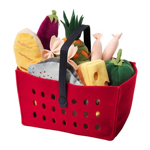 おままごとに。子供は大人の真似をして自分の役割分担を考えることで、社会性を身につけていきます セット内容:チーズ、ソーセージ2、パスタ、パン、ピーマン1、パイナップル1、ナス1、魚1 対象年齢:3歳以上 布地: ポリエステル 100% 中素材: ポリエステル繊維