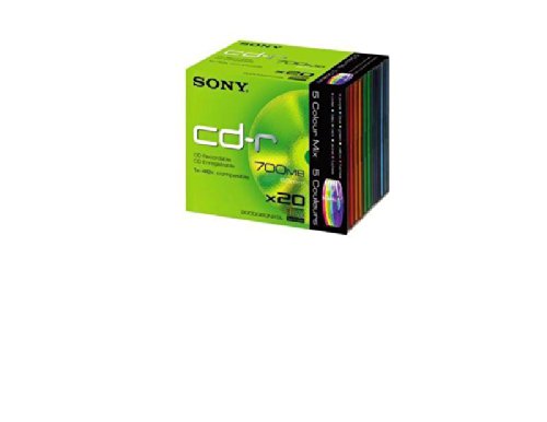 Studio : Sony Publisher : Sony Binding : Accessory Product Description Sony CDR 80min Pack 20 Slim Case coloured Sony's CD-R media provides 700MB of permanent data storage or 80 minutes of digital audio recording and delivers the mechanical precision needed to meet today's high-speed recording requirements. Discs are compatible for playback on CD-ROM, audio CD players and photo CDs. Featuring reading speed up to 48X. Features -High-quality media Provides up to 700 MB capacity on each single disc. Very reliable Compatible with latest recording speeds 0