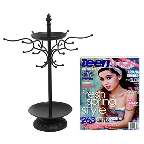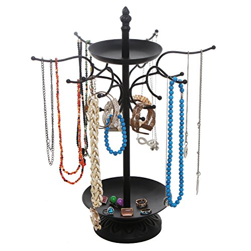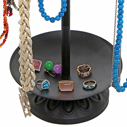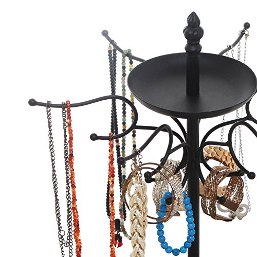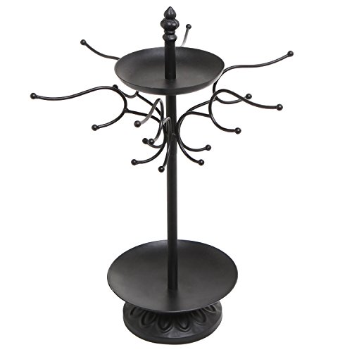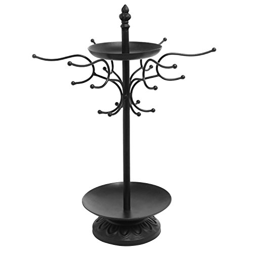 17 Inch Decorative Black Metal 18 Hook Dresser-Top Jewelry Hanger Organizer Rack w/ 2 Round Ring Trays