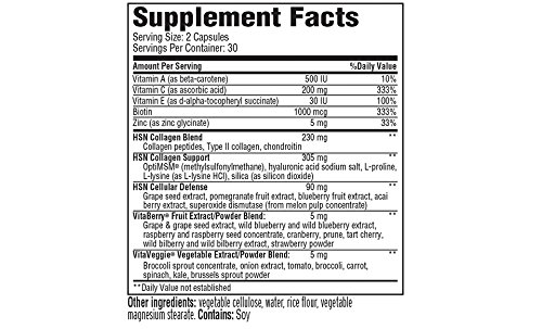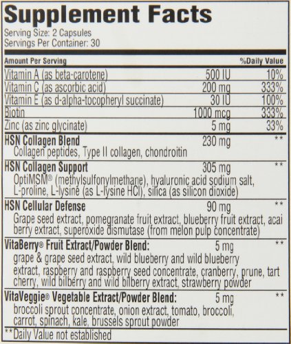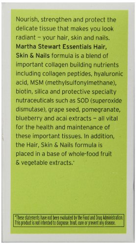-. Binding : Health and Beauty -. Brand : Martha Stewart Essentials -. EAN : 0818757008305 -. Feature : Nourishes and strengthens the delicate tissue that keeps hair, skin, and nails looking radiant. / Protects hair, skin, and nails from harsh environmental exposure with antioxidants, fruits, and vegetables, while providing building blocks to support the production of healthy new collagen tissue with targeted nutrients. / Builds and strengthens collagen tissue with the help of protective specialty nutraceuticals such as collagen, hyaluronic acid, chondroitin, MSM, lysine, and proline. / Addresses oxidative stress that can damage this delicate tissue with the help of antioxidants and phytonutrients from plants, herbs, fruits, and vegetables. -. IsAdultProduct : 0 -. Label : Martha Stewart Essentials -. Manufacturer : Martha Stewart Essentials -. MPN : Martha Stewart Essentials5 -. NumberOfItems : 1 -. PackageQuantity : 1 -. PartNumber : Martha Stewart Essentials5 -. ProductGroup : Health and Beauty -. ProductTypeName : HEALTH_PERSONAL_CARE -. PublicationDate : 2013-11-22 -. Publisher : Martha Stewart Essentials -. ReleaseDate : 2013-11-19 -. Size : 60 -. Studio : Martha Stewart Essentials -. Title : Martha Stewart Essentials Hair, Skin and Nails Supplement, 60 Vegetarian Capsules -. UPC : 818757008305
