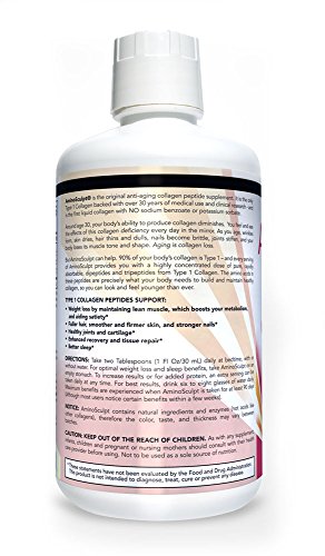 AminoSculpt® is the original anti-aging collagen peptide supplement. It is the only Type 1 Collagen backed with over 30 years of medical use and clinical research - and is the first liquid collagen with NO sodium benzoate or potassium sorbate. Around age 30, your body's ability to produce collagen diminishes. You feel and see the effects of this collagen deficiency every day in the mirror. As you age, wrinkles form, skin dries, hair thins and dulls, nails become brittle, joints stiffen, and your body loses its muscle tone and shape. Aging is collagen loss. But AminoSculpt can help. 90% of your body's collagen is Type 1 - and every serving of AminoSculpt provides you with a highly concentrated dose of pure, rapidly absorbable, dipeptides and tripeptides from Type 1 Collagen. The amino acids in these peptides are precisely what your body needs to build and maintain healthy collagen, so you can look and feel younger than ever.