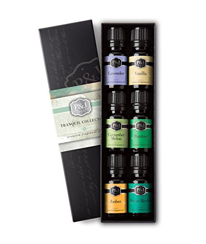 Our Tranquil Set of Premium Fragrance Oils include 1 - 10ml bottle each of: Vanilla, Cucumber Melon, Lavender, Amber, Bamboo, and Ocean Breeze oils. These oils are ready to use as perfumes or as an addition to your candle, soap, bath, or body care formulations.