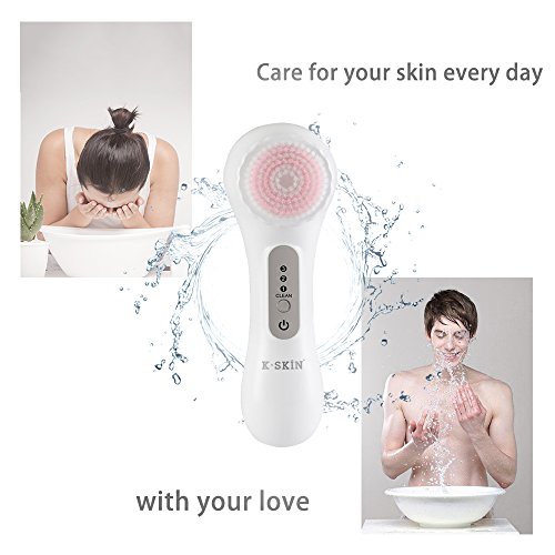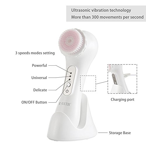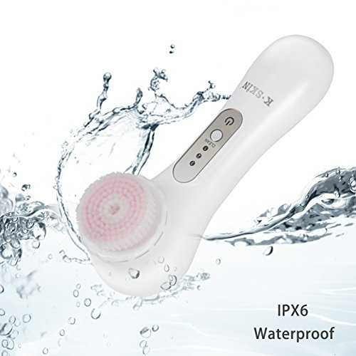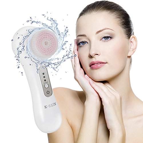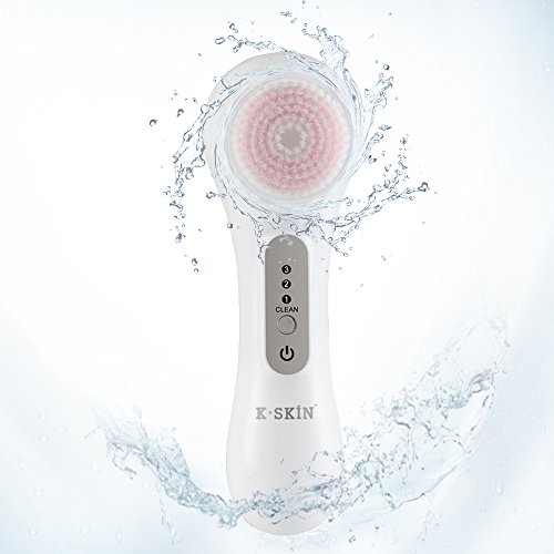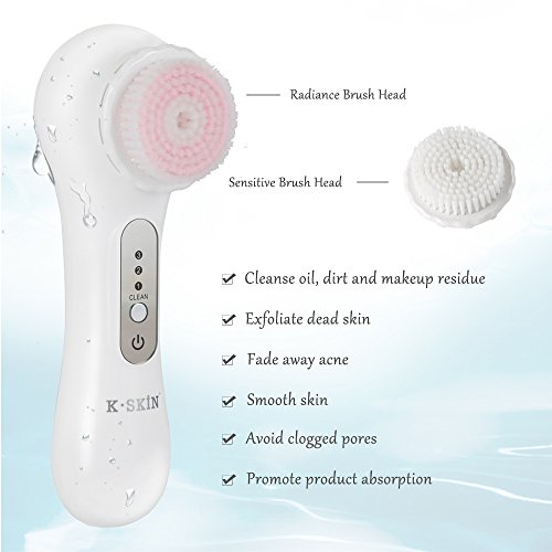 K-SKIN Facial Deep Cleansing Brush Waterproof Exfoliate Pore Smooth Skin for 3 Speeds Modes Setting with 2 Brush Heads (White)