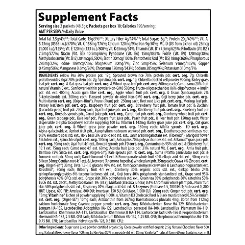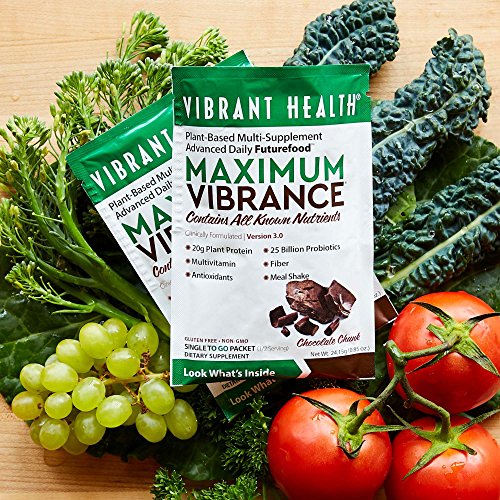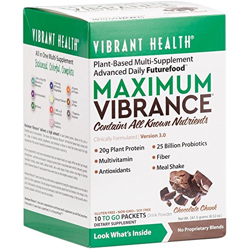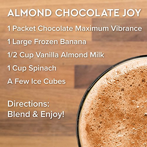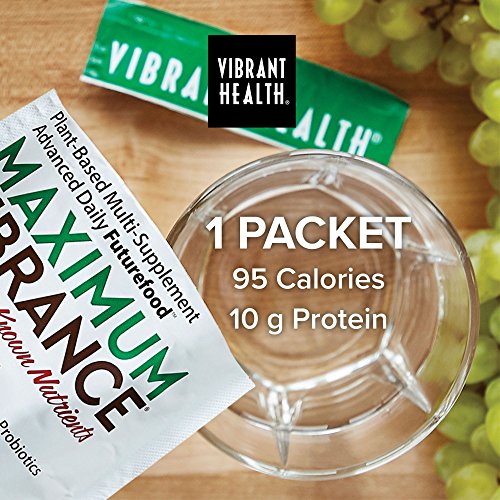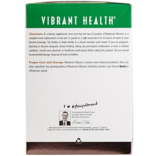 Maximum Vibrance delivers a meals worth of high protein, almost no fat, plus a Paleolithic dose of micronutrients. What is meant by a Paleolithic dose of micronutrients? The term means that Maximum Vibrance will feed the human body a broad and rich range of vitamins, minerals, polyphenols, and nutritional co-factors at levels that closely match the high requirements of the ancient, Paleolithic biochemistry that resides in each of us. We are programmed to need more micronutrients than our modern food can supply. When we don't get enough of them - and there are thousands - biological systems falter or may break down entirely. Immunity, growth, maturation, healing, cardiac health, skeletal health, and a broad number of body systems may begin to function poorly. The only group of essential nutrients absent from the formula is the omega-3 fatty acids. Unfortunately, technology has not yet developed a stable form of powdered omega-3s. Rest assured, when it becomes available it will find its way into our product. The organic cereal grass juice powders, spirulina, ample chlorella, vegetables and fruits deliver broad nutrition and effective detoxification. Our classically powerful blend of 25 billion probiotics per serving from 12 strains of beneficial bacteria, are here too, just as they are in Green Vibrance. Use two packets (enclosed in the jar) for a complete meal replacement or one packet to your beverage for a light substitution. Either way, the pleasant taste of Maximum Vibrance permits its use in any beverage from water through juices to almond milk, or any smoothie. Maximum Vibrance contains 120 ingredients which include 80 plants, 26 antioxidants, 6g of fiber, 7 servings of fruits and vegetables, 7 vegetable based digestive enzymes, 20g of protein and so much more!Feature