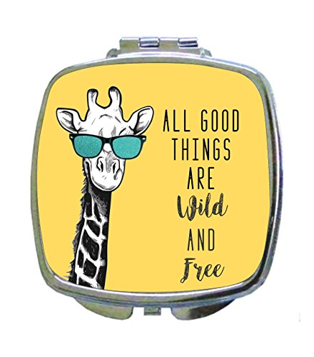All Good Things Are Wild and Free - Quote - Hipster Giraffe in Blue Shades - Compact Mirror in Silvertone - Square Shaped - Pocket Sized