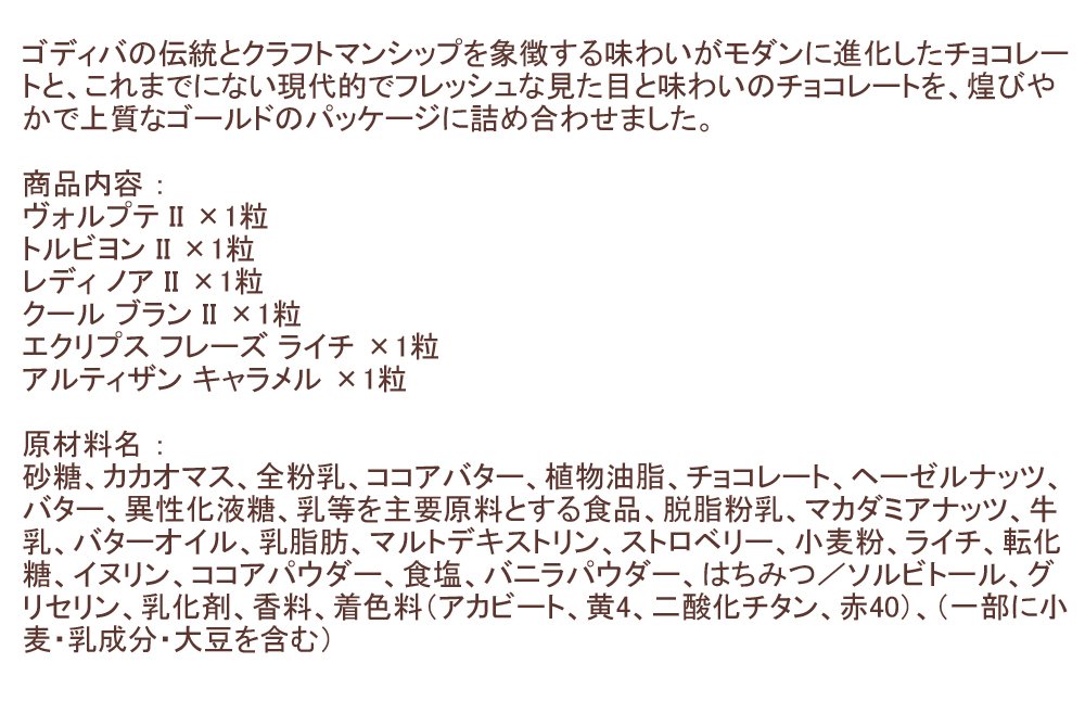 ゴディバの伝統とクラフトマンシップを象徴する味わいがモダンに進化したチョコレートと、これまでにない現代的でフレッシュな見た目と味わいのチョコレートを、煌びやかで上質なゴールドのパッケージに詰め合わせました。