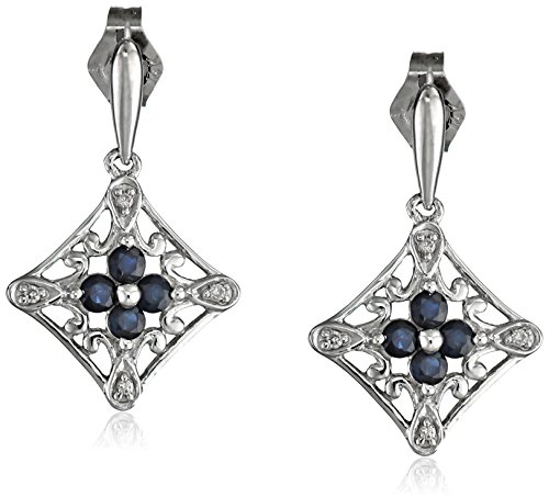 The deepest blue of the ocean is no match for these mesmerizing White Gold Sapphire and Diamond Drop Earrings. Each earring displays four round sapphires surrounded by four round sparkling diamonds (.4c) to create a dazzling complement to your evening attire. Accentuating the rich blue of these delicate beauties is the diamond-shaped white gold decorative scrollwork that outlines the entire earring. The pair features a prong setting and 14k gold post with friction back. Sure to be loved my many, but for the person with a September birthday, these are an essential addition.Feature