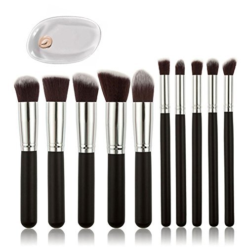 10PCS Oval Makeup Brush Set + Makeup Sponge Puff Professional Kabuki Cosmetic Foundation Blending Eyeliner Face Powder Contour Cream Make up Brush Kit BESTLAND (Silver-Black)