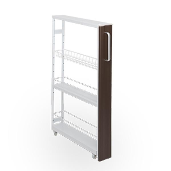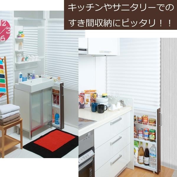 | ティッシュやシャンプーサイズの隙間があれば、大容量の立体収納ができます!本体を分解しなくても、カゴ棚の位置変更が簡単にできます。取っ手とキャスター付なので出し入れもラクラク♪ |