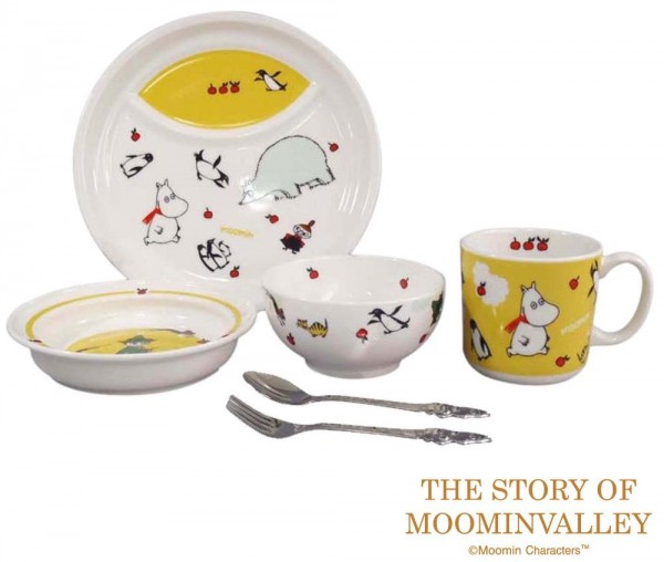 ムーミンのイラストが描かれた可愛い子供用食器の6ピースセット。 |