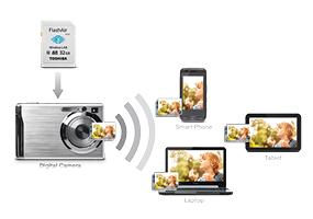 The FlashAir II Wireless SD Card is ultra easy to use—and compatible with most digital cameras. Forget about special drivers, software or carrying cables just for data transfer. Simply slide the card into your digital camera or camcorder. Its built-in wireless LAN access point requires no Internet connection to share pictures on devices or social networks—just your excitement.