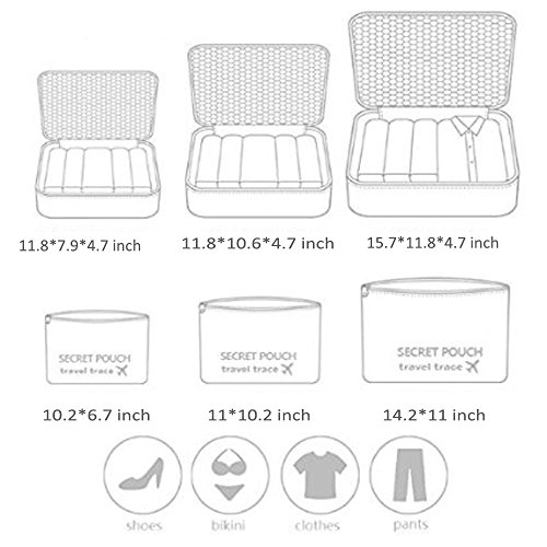 Pack More Clothes in a Small Space For Your Next Trip One of the toughest things to do while packing for a trip is fitting everything you want to bring with you into your luggage. Our packing cube system fixes that issue by neatly packing all your clothes tightly into our space saving bags. It allows you to easily store and organize your clothing that makes it easy to pack and even easier to unpack. Your clothes will stay more wrinkled free and not get crushed during your travels. There're 3 laundry bags with your cube set so that you can separate your dirty clothing from your fresh clothes on your journey back home. 0 |