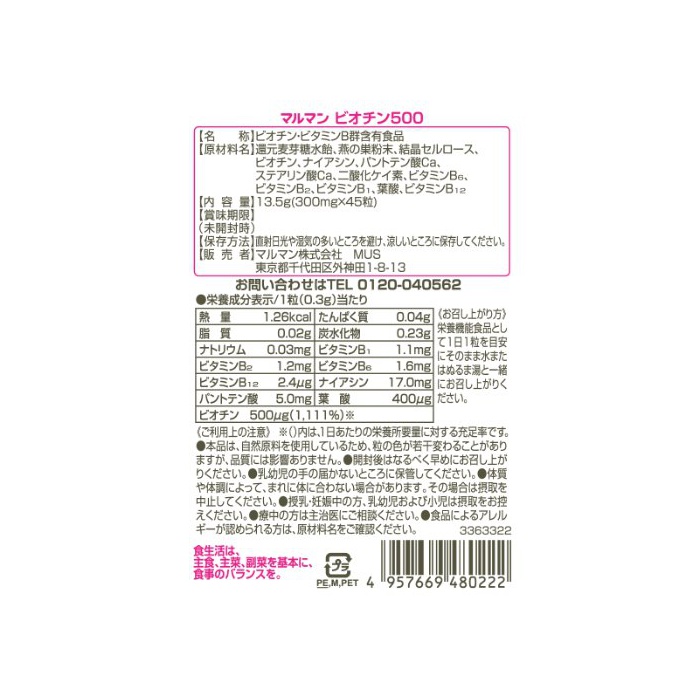 영양 성분 : 영양 성분 표시/1알(.3g)당첨되어 열량1.26kcal,지질0.02g,나트륨0.03mg,비타민B21.2mg,비타민B122.4μg,판토텐산.5.0mg,단백질0.04g,탄수화물0.23g,비타민B1 1.1mg,비타민B6 1.6mg,나이아신17.0mg,엽산400μg,《비오친》 500μg(1.111%)※()중(안)은 1일(날)당의 영양 소요량량 에 대하는 충족율입니다.