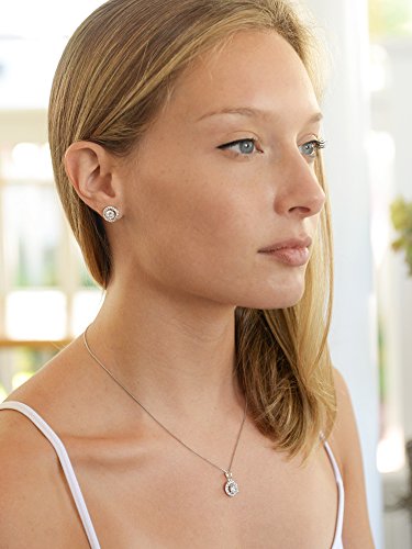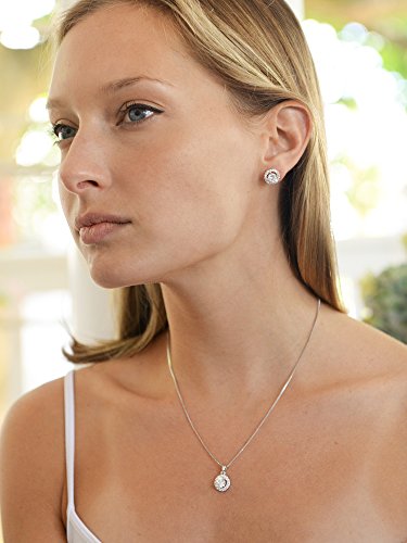 Good things come in small packages and this top selling Mariell necklace and earrings set is no exception. With brilliant AAAAA quality Cubic Zirconia plated in Genuine Platinum, the round halo solitaires and matching pendant have the look of fine jewelry at a fraction of the cost. Sleek modern styling, understated glamour and a dainty silhouette define this bridal favorite. With its luxurious diamond-like elegance, our glistening set makes a fabulous gift for bridesmaids, holidays, birthdays and anniversaries. It's perfect for prom, homecoming, mothers of the bride and any special occasion gown. Despite its dainty size, this versatile "must-have" CZ set packs some serious sparkle. We love how this Zirconium beauty will not only adorn your formal frocks but will glisten with a business suit or jeans and a Tee. Basically, this necklace and earrings set is the "little black dress" of jewelry. For everyday wear, we love the stud earrings or pendant necklace worn alone to really give the look of fine jewelry. No one but you will know these aren't priceless gems! Our delicate CZ Pave Halo pendant measures 10.5mm (7/16" round) and features a 0.75 carat. pronged round-cut (6mm) center stone. The pendant is on a Platinum plated box-chain necklace (adjustable 16� - 18� ). Each of the 10.5mm stud earrings measures 7/16� round and boasts a 0.75 carat (6mm) pronged solitaire. Posts with Comfort Disk Backs. Treat yourself or someone you love to classic "Breakfast At TIffany's" glamour. Lifetime Guaranteed. We promise you'll love this best-seller or your money-back.Feature