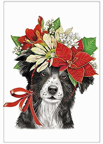 Border Collie Dog Christmas Poinsettia Crown 100% Cotton Flour Sack Dish Tea Towel - Mary Lake Thompson 30" x 30"