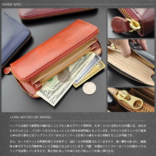 -. Feature : サイズ:(約)長さ20.5cm×幅10.0cm×厚み2.3cm / 素材:表面⇒フルベジタブルタンニンイタリアンレザー(牛革)/内部⇒国産ヌメ革 / 仕様:開閉ファスナー/メイン収納×3/カードポケット×12/内部ファスナー式小銭入れ/フリーポケット×5/YKKファスナー / カラ-:ブラックorネイビーorボルドーorマルーン / 付属品:純正BOX