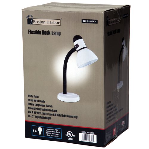- Feature : Boston Harbor White Flexible Table Lamp / Lamp has a white finish with a round metal shade / Uses a 60 watt maximum A-19 bulb (sold separately)