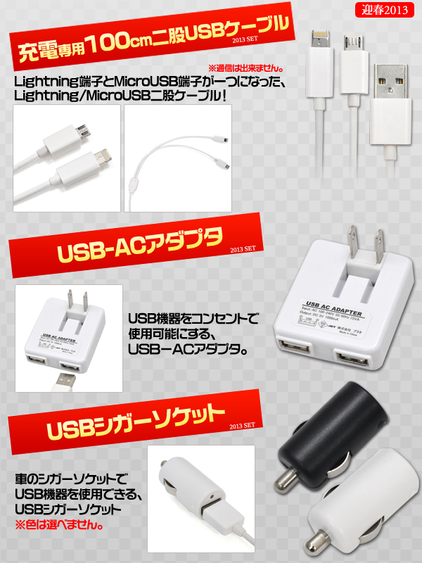 Lightning・MicroUSB二股USBケーブル/USBシガーソケット/USB-ACアダプタ