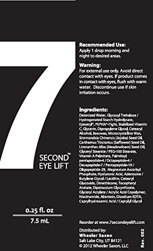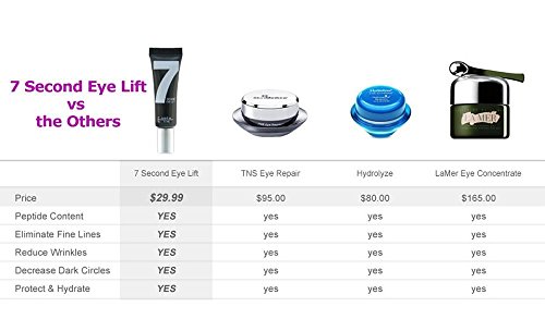 7 Second Eye Lift's Powerful Ingredients End the Waiting Game! No other product available has ever been able to reduce the signs of aging around the eyes as fast as 7 Second Eye Lift; and it's not even close. The powerful patented peptides and age-fighting ingredients in 7 Second Eye Cream make all the difference. Start getting the younger looking eyes faster than you thought possible!Feature